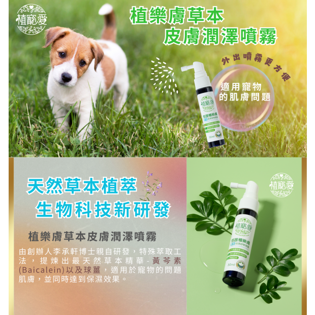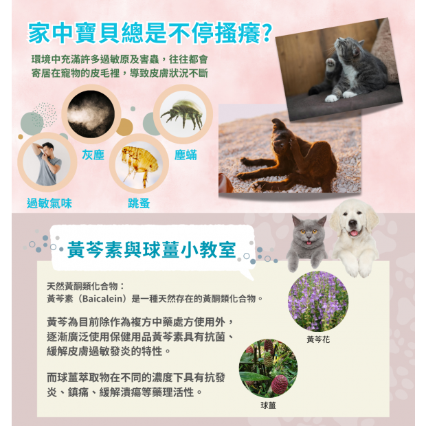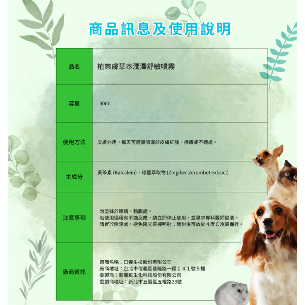 台灣花蓮產黃芩,富含黃芩素(Baicalein)成份台灣紅球薑,球薑酮成份雙功效全天然成份外出攜帶,隨時舒緩皮膚不適不含類固醇、抗組織胺、抗生素水劑噴霧,不沾手,乾爽不油膩不含香精,貓咪使用也好安心皮膚外用 使用前搖一搖人寵友善
